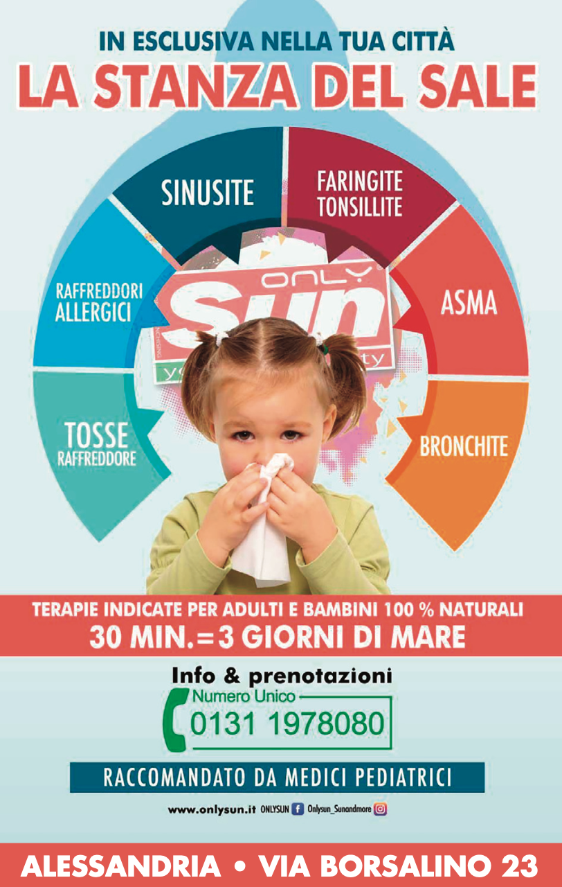 ALESSANDRIA – Anche ad Alessandria è ora disponibile presso Onlysun, in via Borsalino, 23, la Grotta di Sale, un metodo naturale, raccomandato da medici pediatrici, ideale per la cura di disturbi tra i quali sinusite, raffreddori allergici, tosse, asma bronchite, faringite, tonsillite. Basti pensare che 30 minuti di trattamento equivalgono a tre giorni di mare.