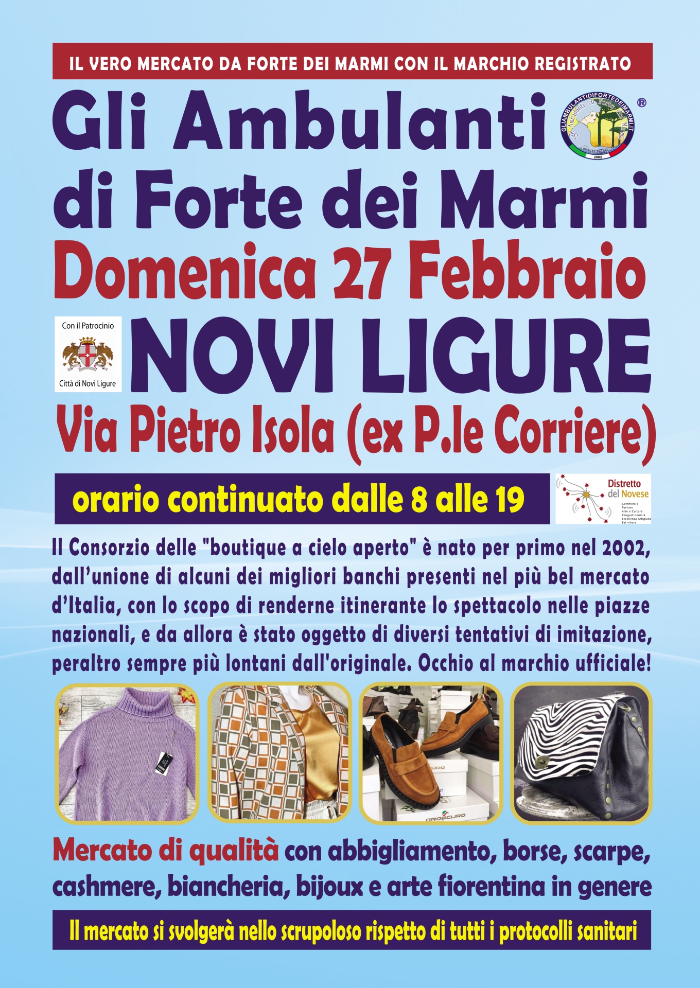 Le ormai mitiche “boutique a cielo aperto” dell’originale Consorzio saranno domenica 27 febbraio a Novi Ligure in Via Pietro Isola (ex Piazzale Corriere), in collaborazione con l’Amministrazione Comunale ed il Distretto del Commercio e Turismo del Novese. Dunque, una giornata da non perdere assolutamente per i tanti appassionati del genere, con un mercato di qualità che sarà come sempre all’insegna dello shopping più glamour e conveniente, con orario continuato, anche in caso di maltempo, dalle 8 alle 19, e nel rispetto scrupoloso di tutte le indicazioni di sicurezza.