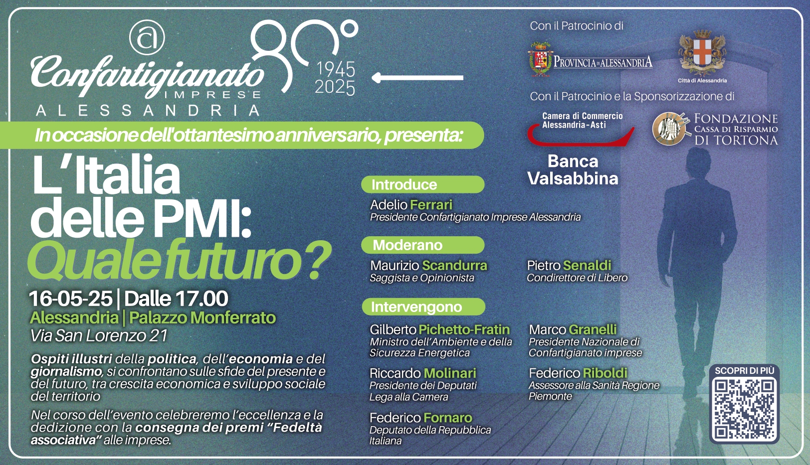 Venerdì 16 maggio a Palazzo Monferrato in Via San Lorenzo 21 in Alessandria, a partire dalle ore 17.00, si terrà un Talk-Show dal titolo “L’Italia delle PMI: Quale futuro?” durante il quale ospiti illustri dell’economia, del giornalismo e della politica, alla presenza di un parterre selezionato di oltre 100 tra rappresentanti delle istituzioni locali, imprenditori ed invitati, illustreranno la loro visione del nostro tempo e le sfide che ci attendono nel prossimo futuro, declinate in chiave di sviluppo economico e sociale del nostro territorio.